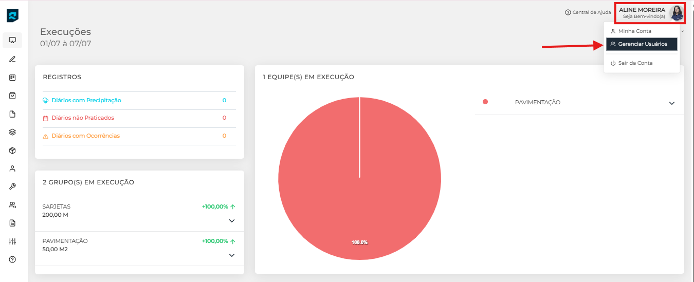 Para criar um novo usuário no RDObras, clique no “ícone do seu perfil” no menu superior fixo, localizado no canto direito e em seguida selecione a opção “Gerenciar Usuários”.
