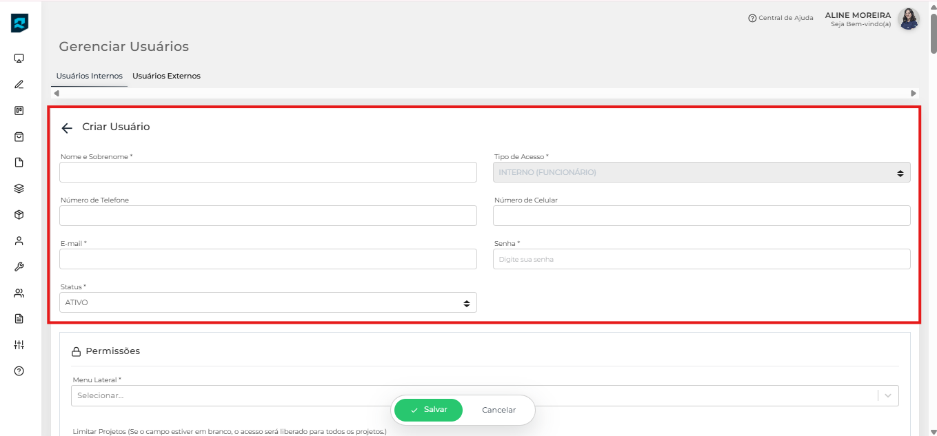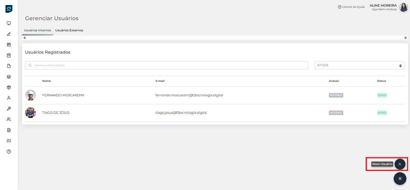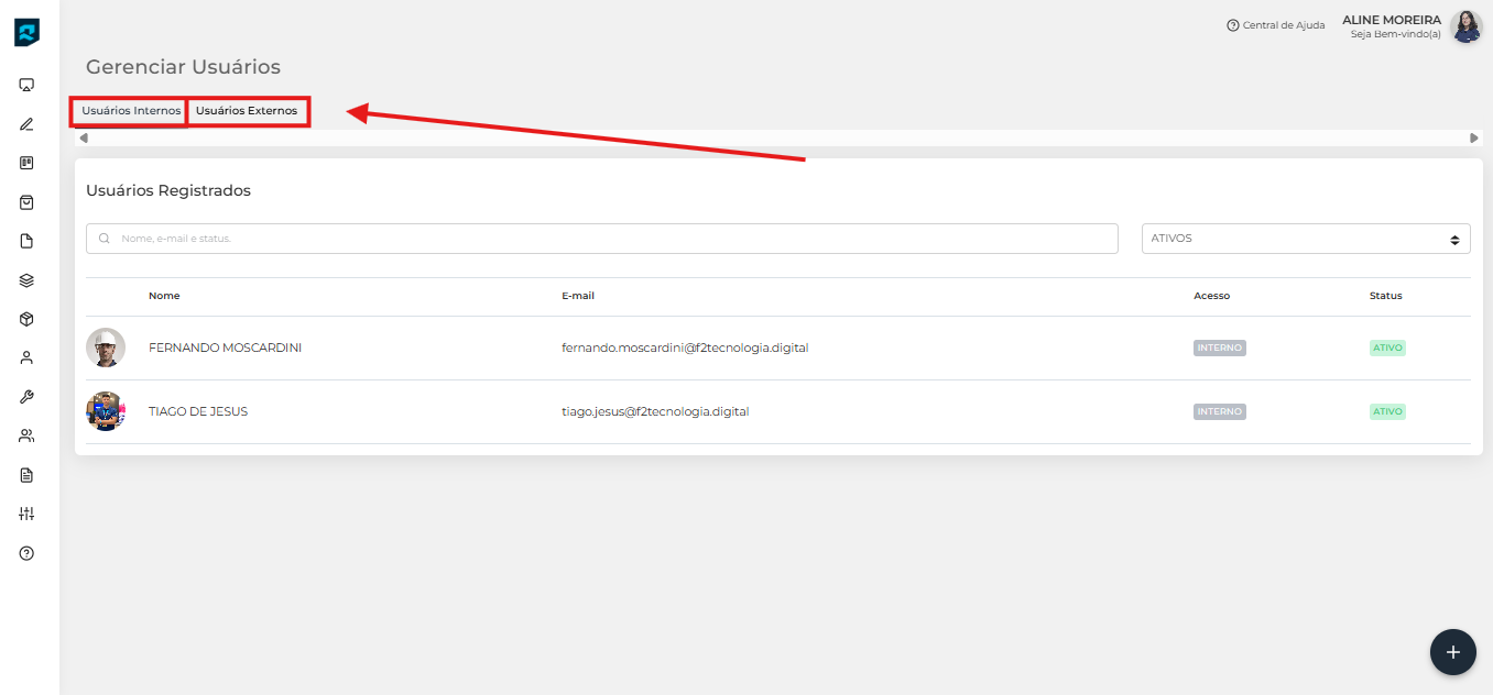 Se você estiver cadastrando um usuário para um de seus colaboradores, selecione a aba “Usuários Internos”, ou se for para um cliente, selecione a aba “Usuários Externos”.