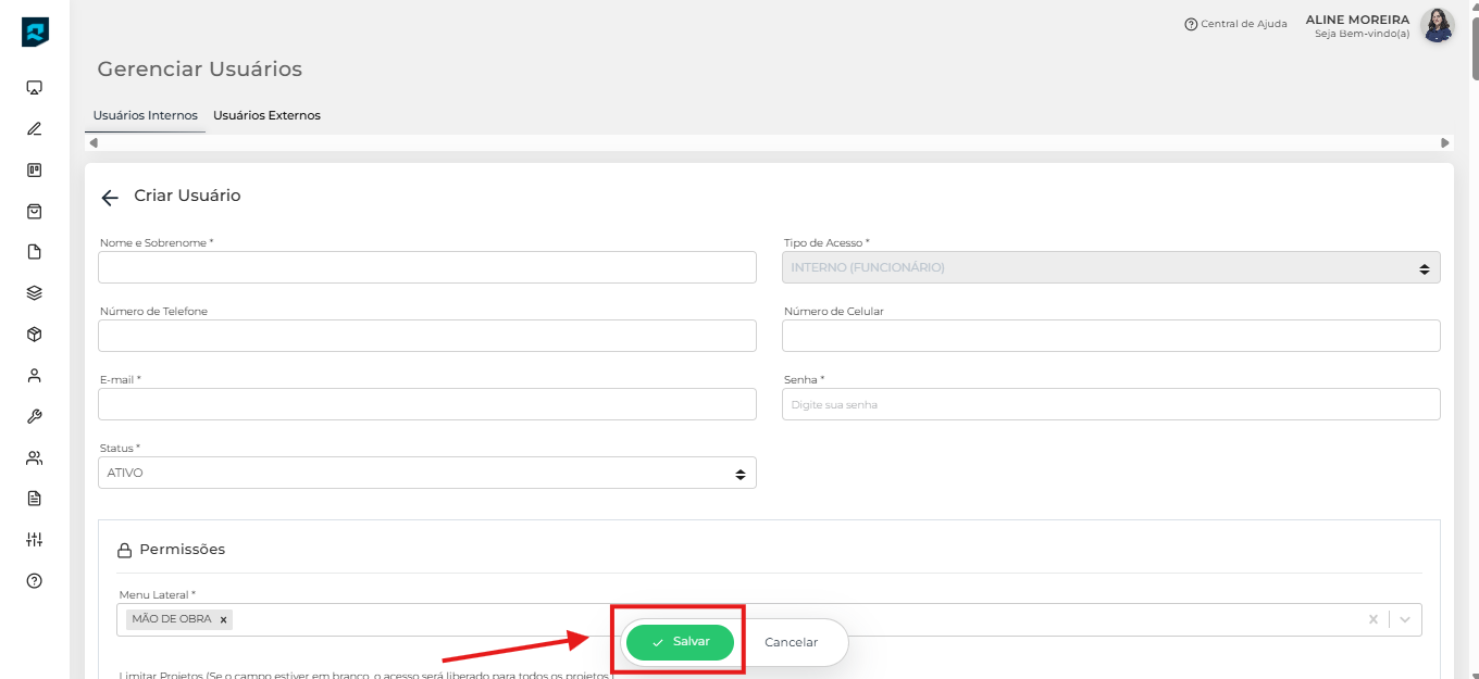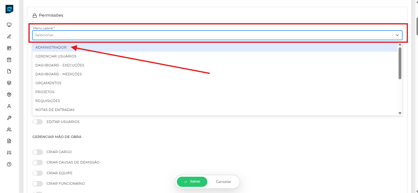 - Por outro lado, se você estiver cadastrando um usuário com funções específicas, como líderes de obras, analistas ou auxiliares, atribua apenas as permissões necessárias de acordo com suas responsabilidades.