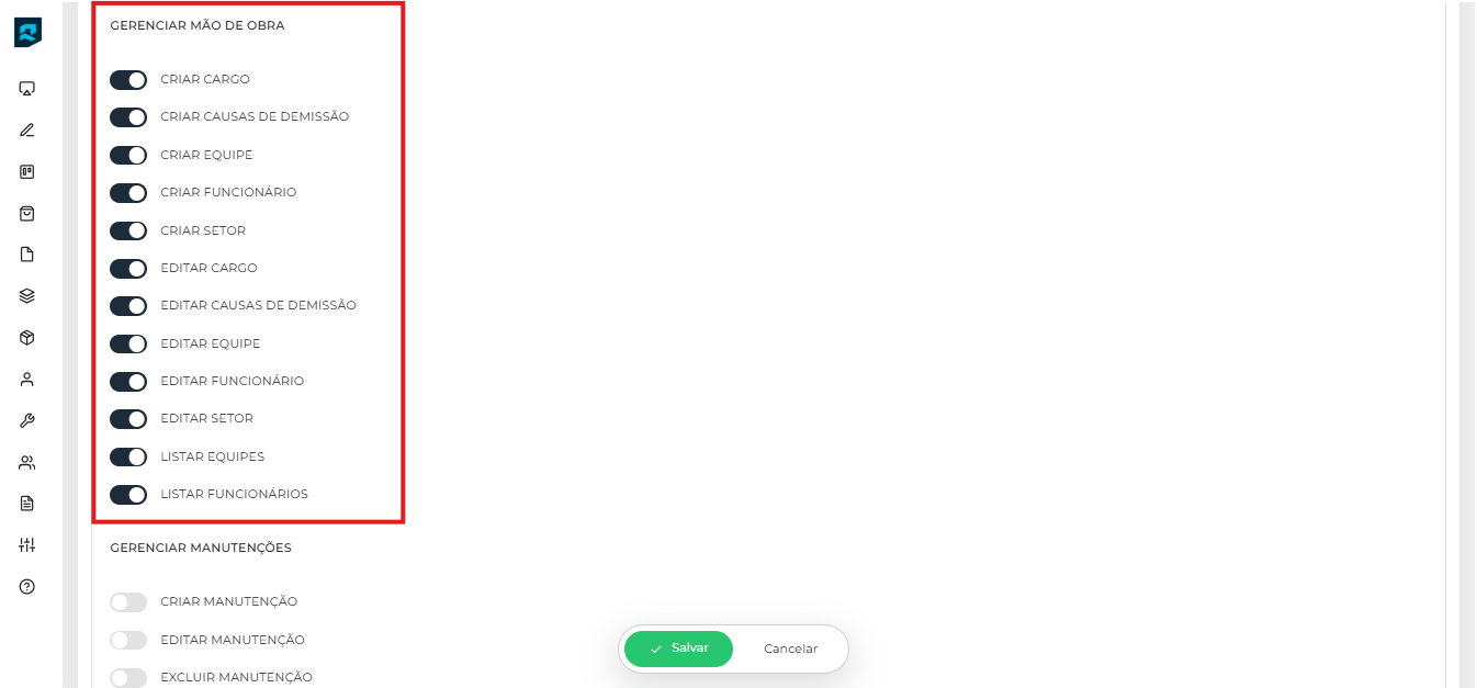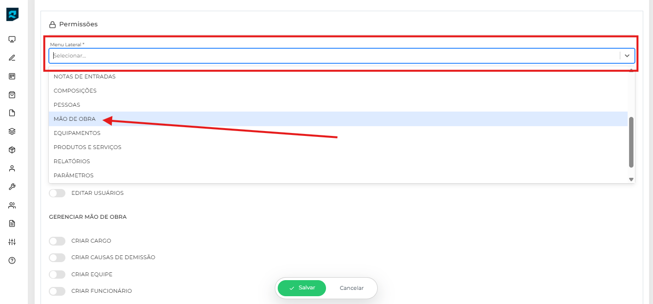 Por exemplo: Para o usuário responsável pelo departamento pessoal, selecione as permissões da aba "Mão de obra".