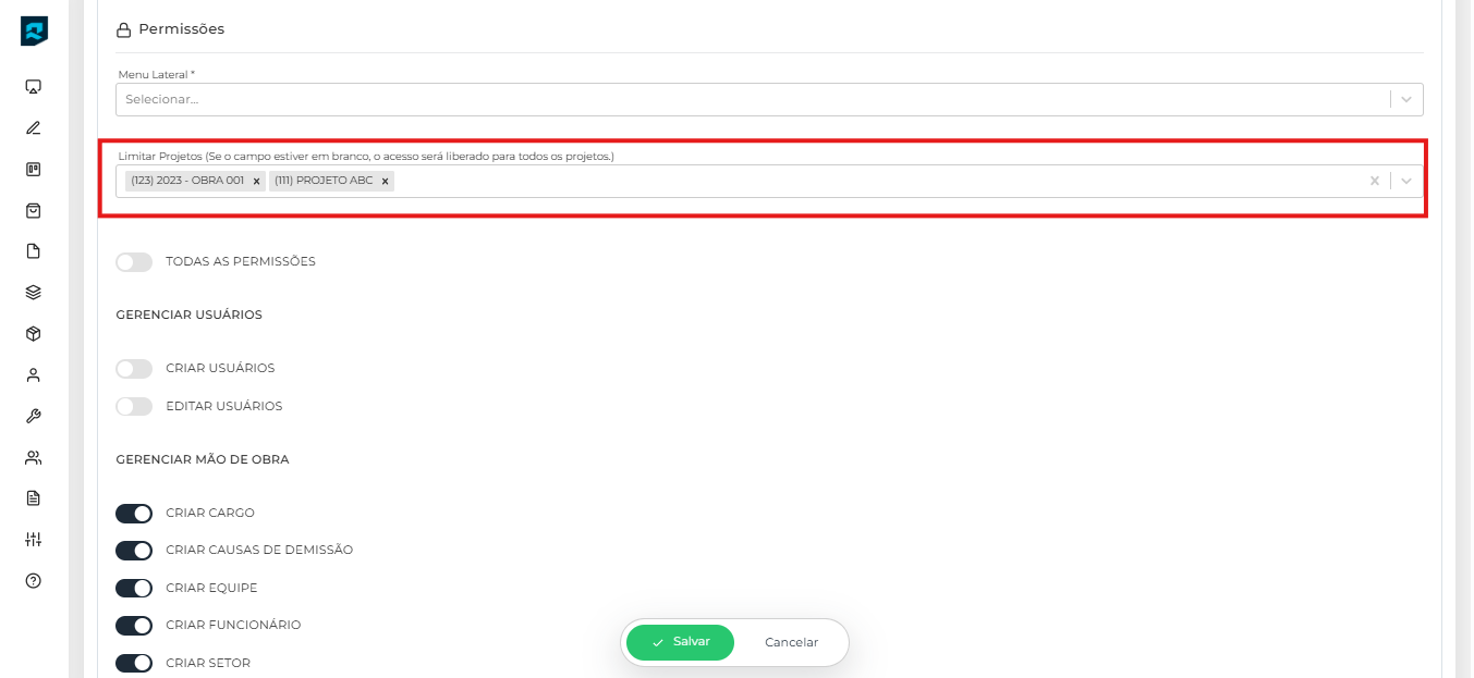 Por exemplo, se um engenheiro gestor de obras tem acesso restrito apenas aos projetos "Obra - 001” e “Projeto ABC", selecione apenas essas opções no campo. Agora, se ele precisar acessar todos os projetos, basta deixar o campo em branco.