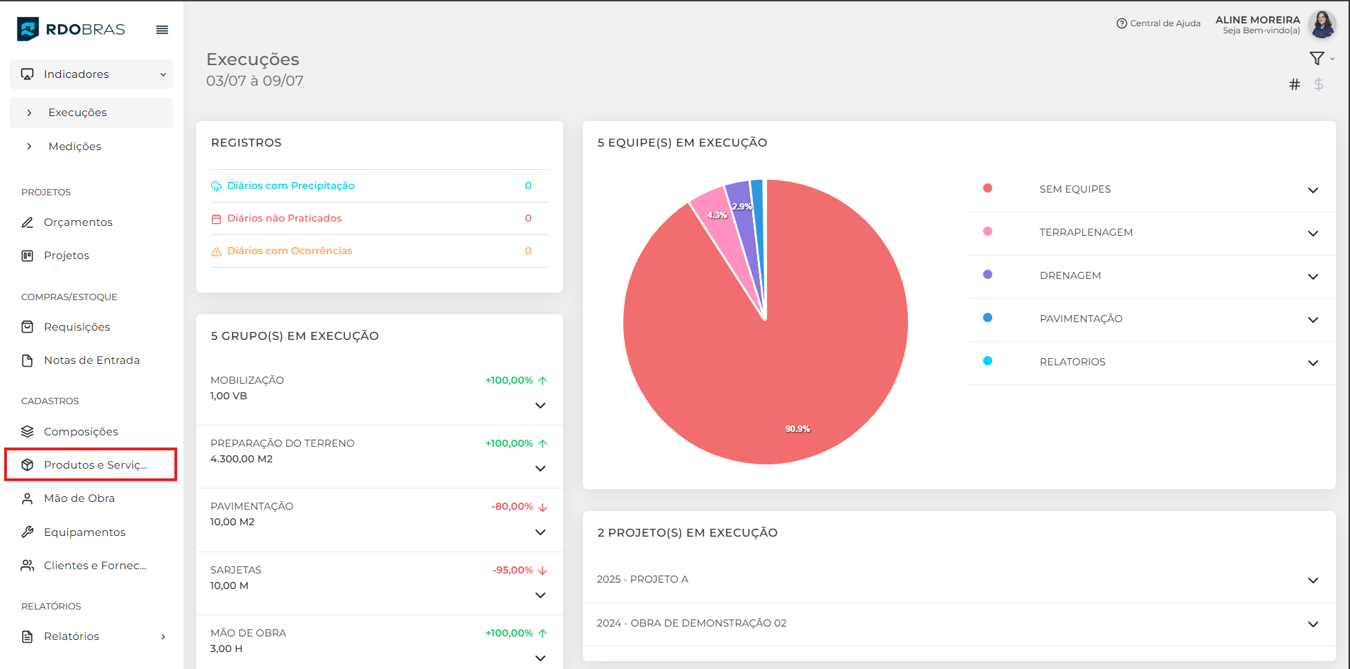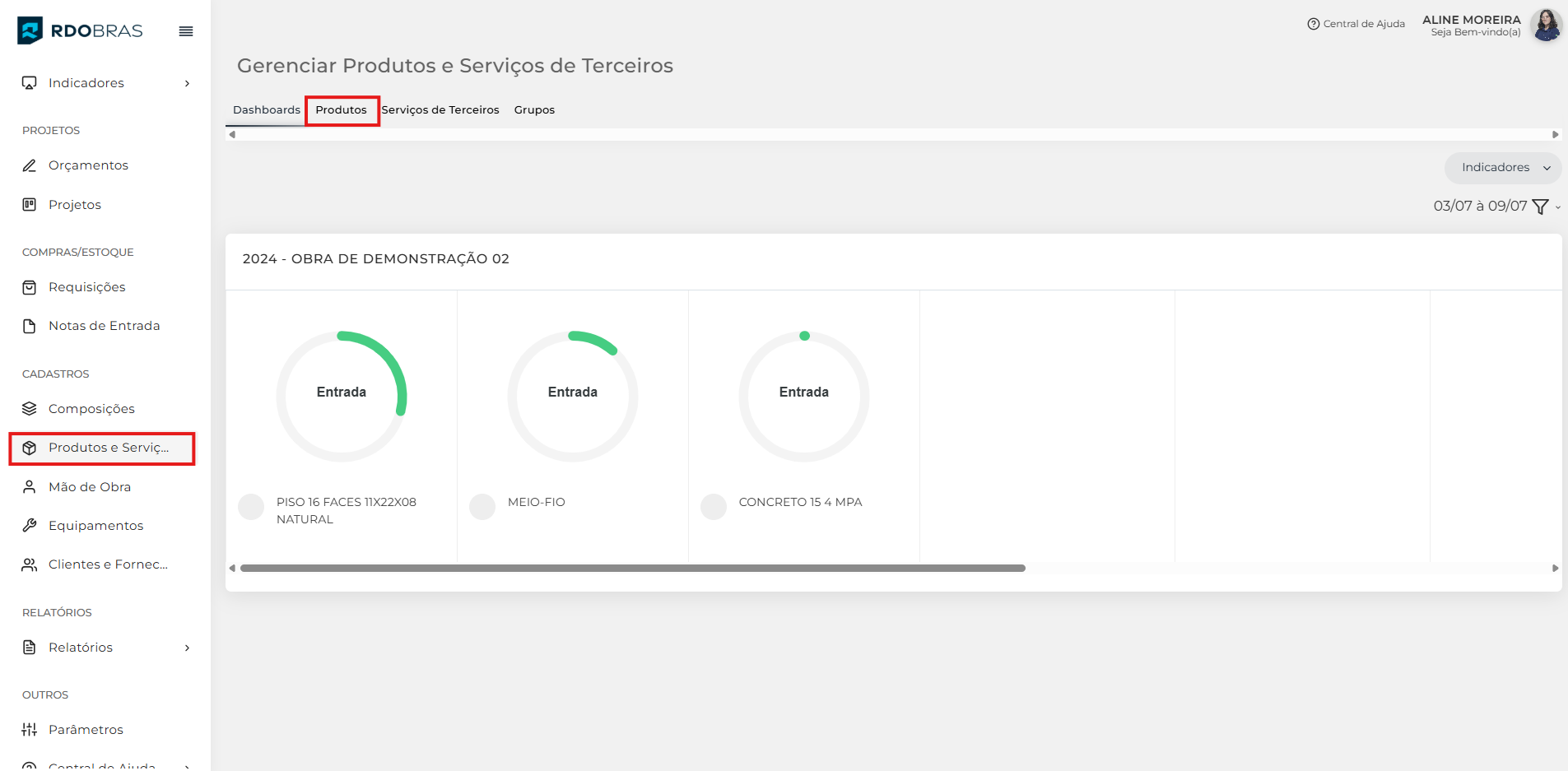 Para realizar o cadastro dos seu produtos no RDObras será necessário acessar a aba "Produtos e Serviços de Terceiros" através do menu lateral.