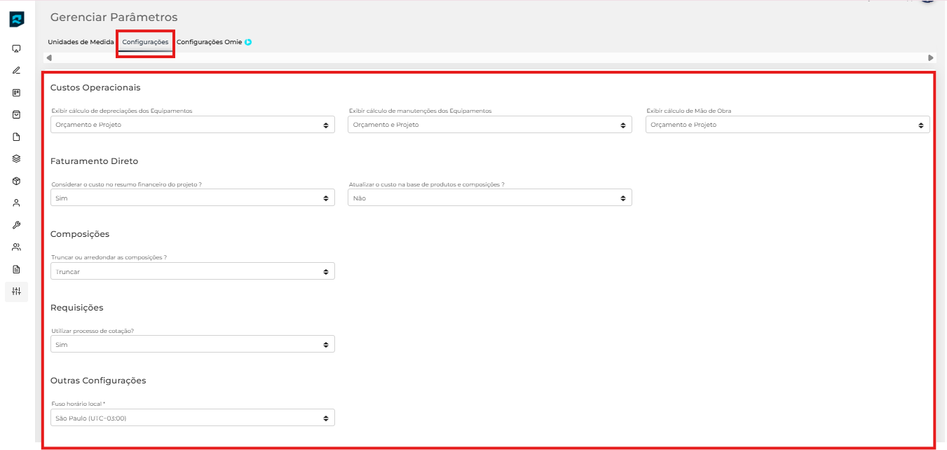 Na aba “Configurações”, você poderá ajustar o comportamento do sistema de acordo com as particularidades da sua empresa. Aqui estão alguns exemplos: