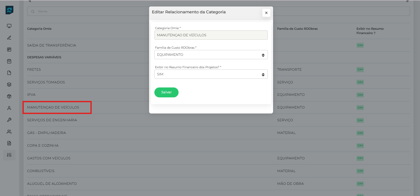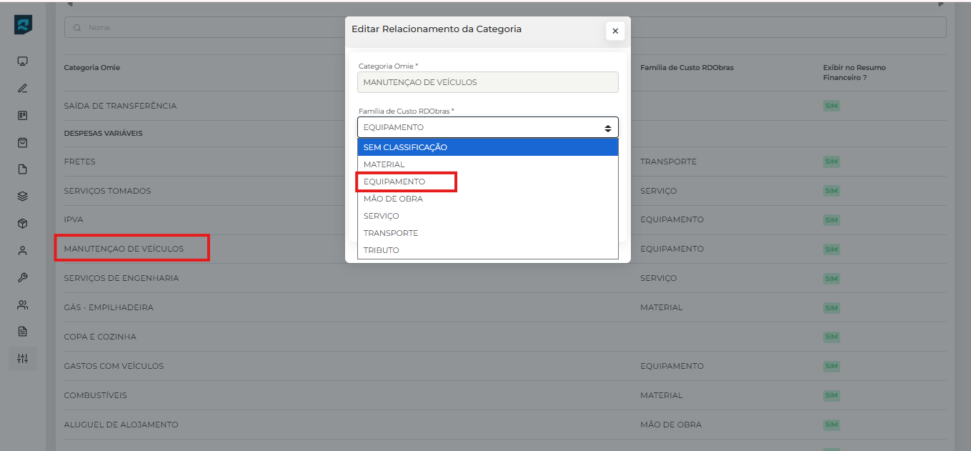 Aqui, você fará a associação entre as categorias do plano de contas do Omie e as famílias de custos do RDObras.