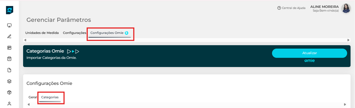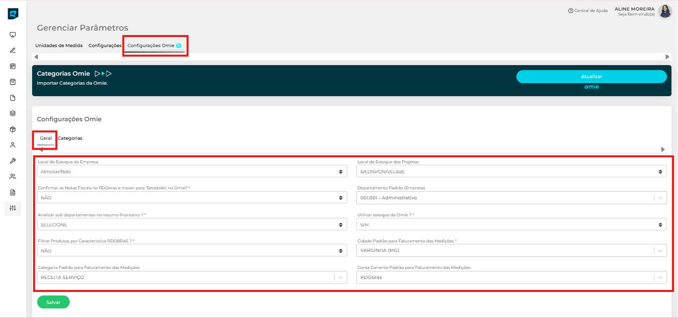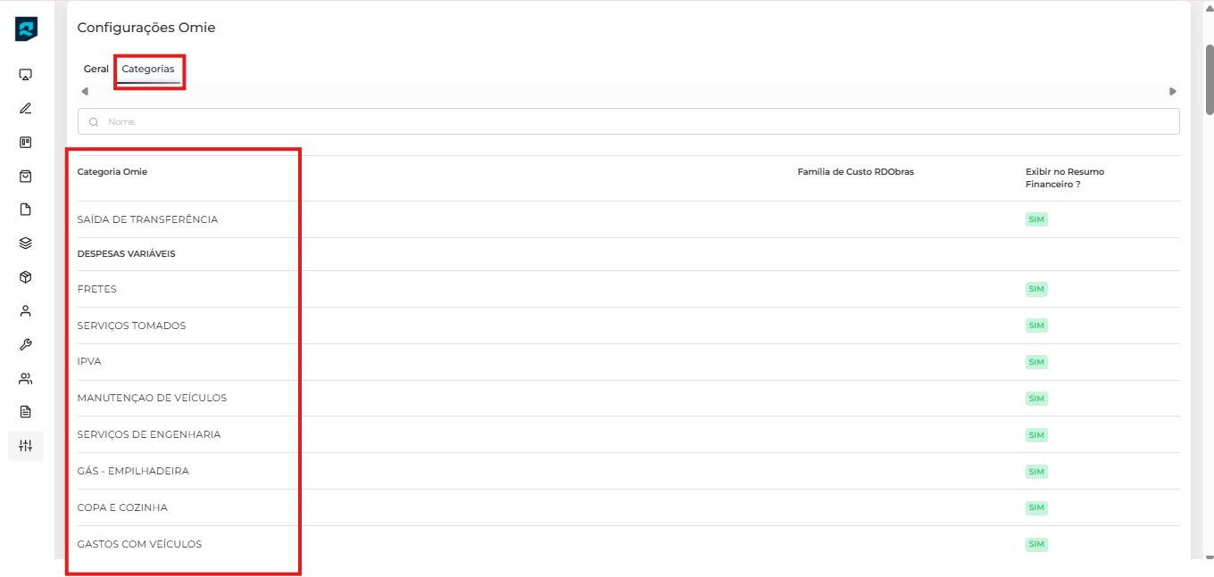 A aba “Categorias” é essencial para integrar corretamente os dados financeiros entre o Omie e o RDObras.
