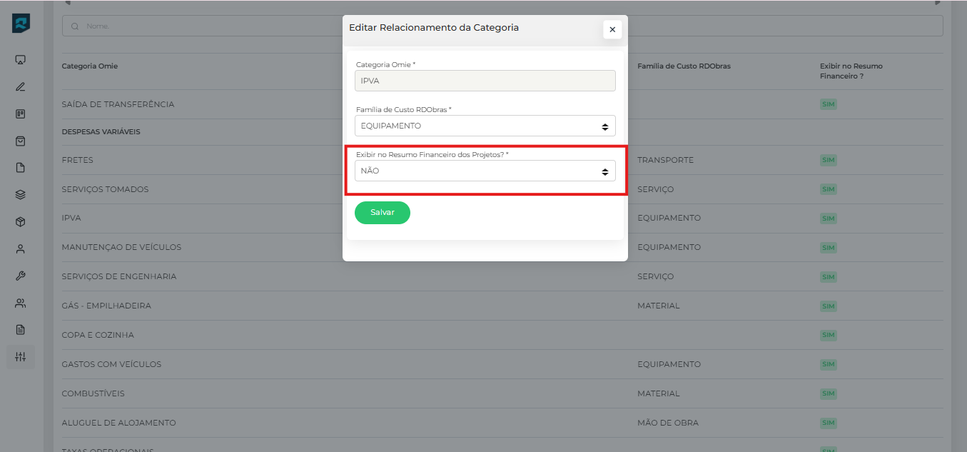 Na opção “Exibir no Resumo Financeiro dos Projetos”, marque como “Não”;