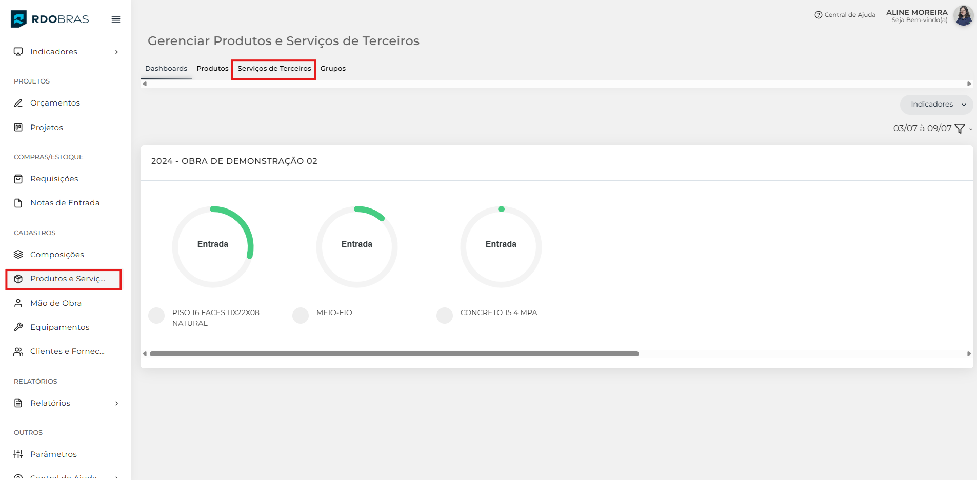 Para realizar o cadastro dos seus serviços de terceiros no RDObras será necessário acessar a aba "Produtos e Serviços de Terceiros" através do menu lateral.