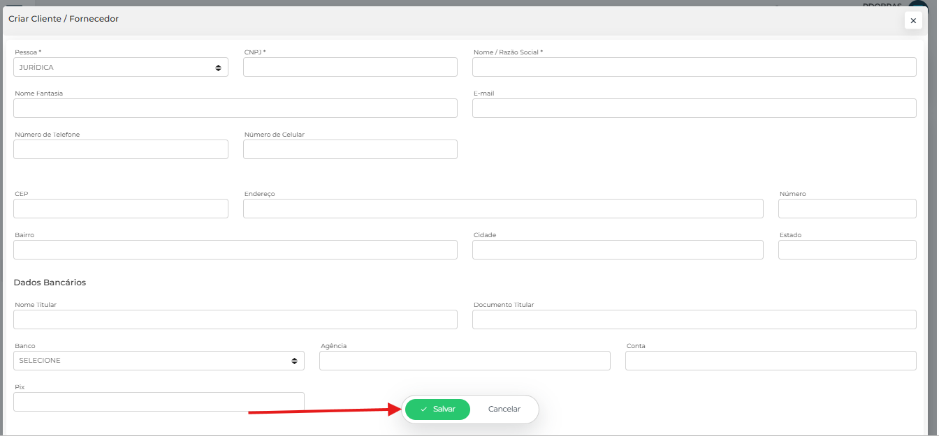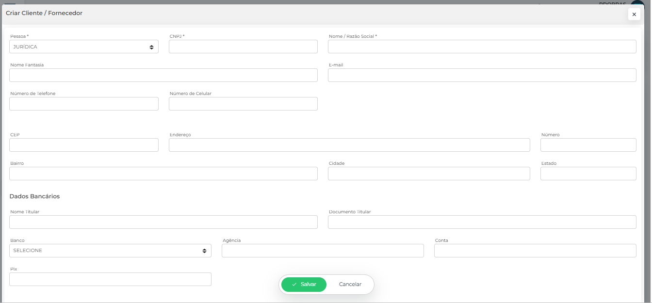 Feito isso, uma nova tela será carregada para que você insira os dados desse cliente ou fornecedor.