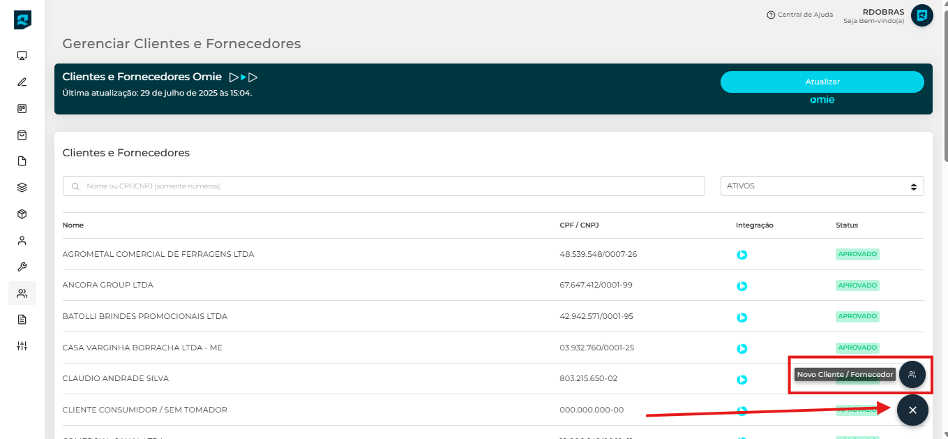 Lembrando que a correta digitação do CPF/CNPJ é de extrema importância para que ocorra a integração do cadastro realizado com o Omie.