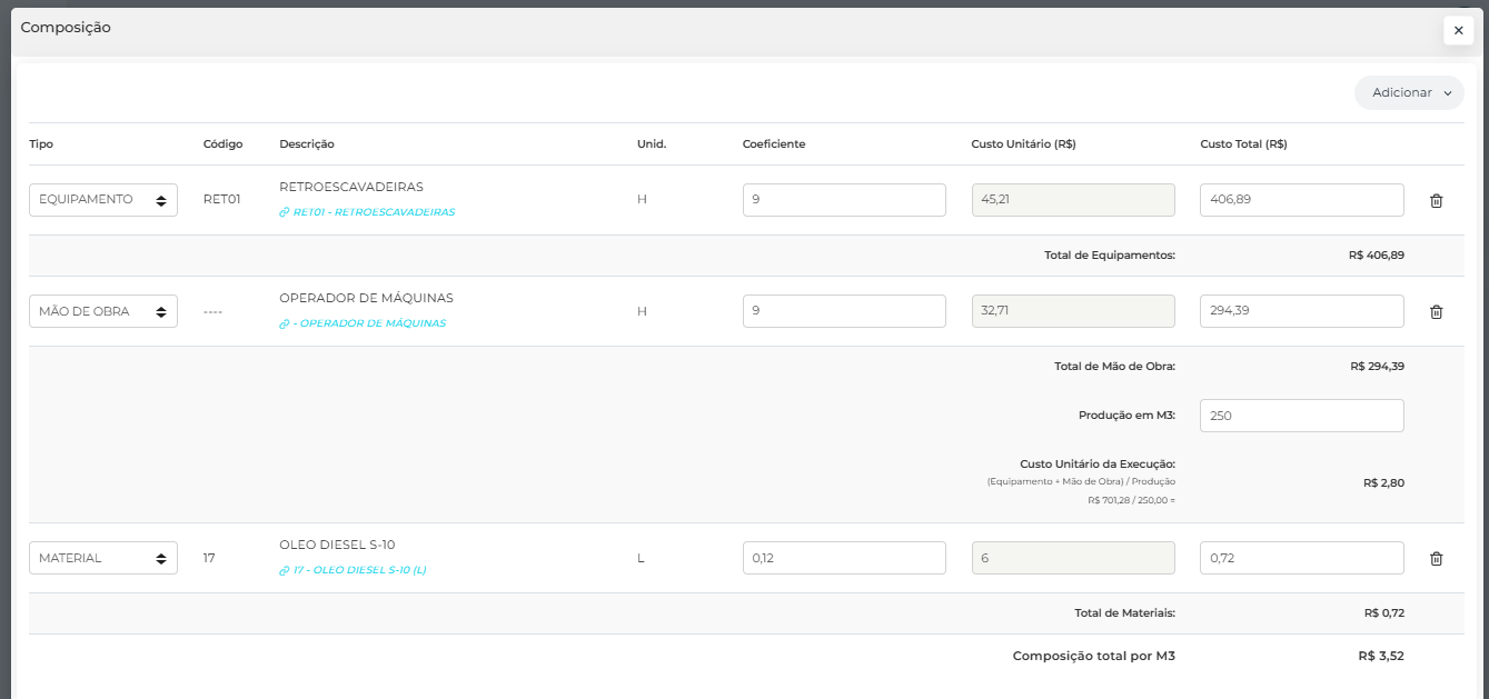 Abaixo é possível observar um exemplo de composição de forma macro, relacionada ao serviço de escavação. Nela podemos observar os tipos de gastos esperados para a execução do serviço, assim atingindo um valor aproximado para a execução de 1 m³ do serviço Escavação.