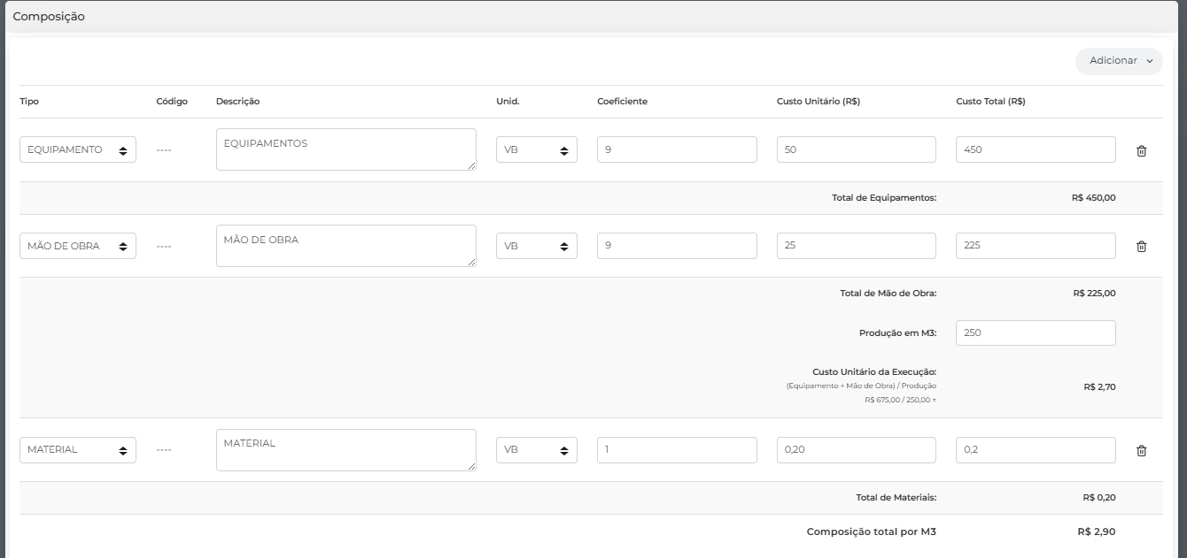 Ao cadastrar dessa forma garantimos mais previsibilidade acerca dos itens associados ao serviço cadastrado. Isso ocorre pois todos os itens necessários para a execução do serviço são informados na composição é possuem seus coeficientes definidos, assim resultando em um valor unitário do serviço mais assertivo.