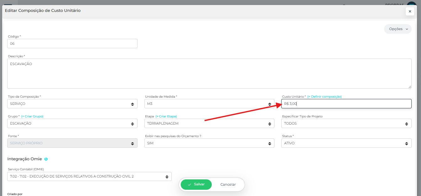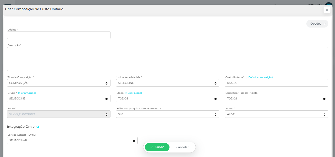 Também é possível informar apenas o custo unitário total, sem discriminar a origem dos custos, preenchendo diretamente o campo custo unitário.
