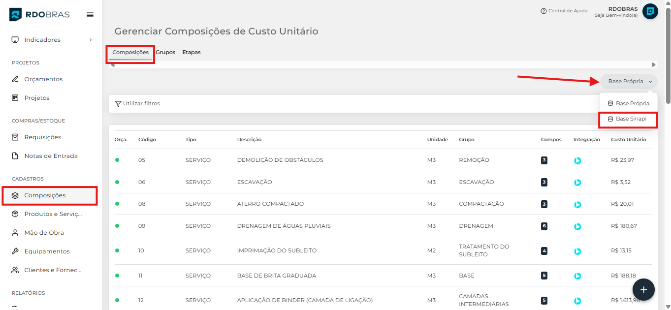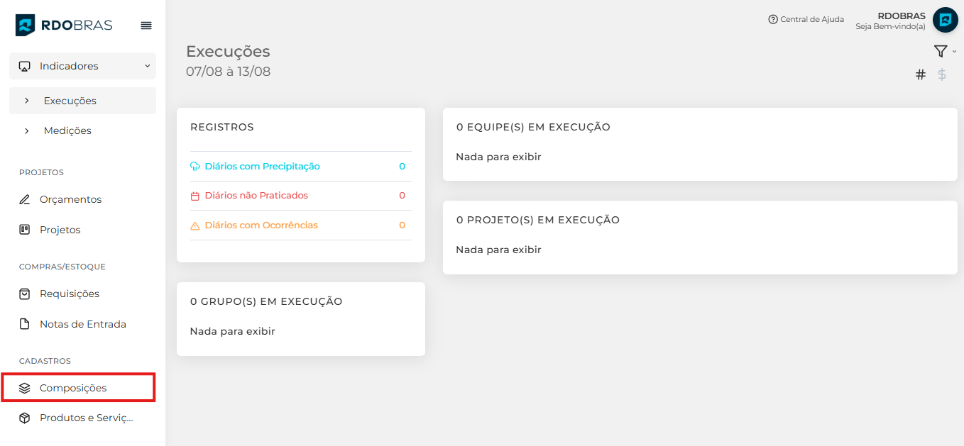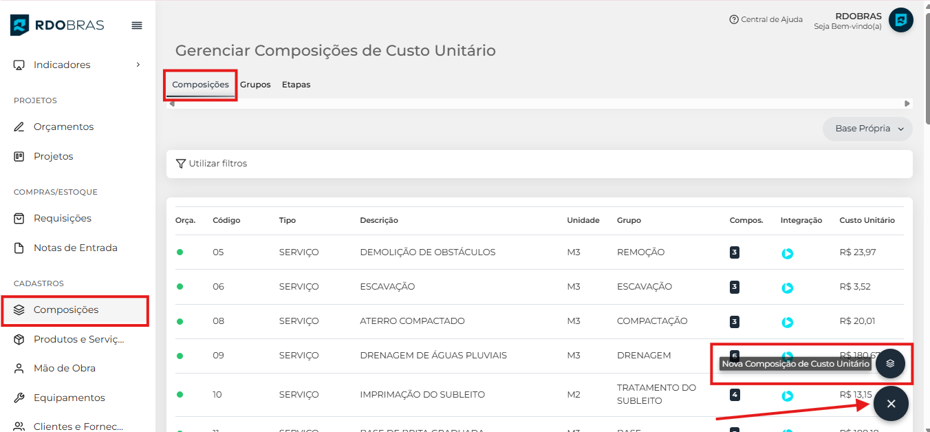 Para criar uma composição de custo unitário no RDObras, acesse, através do menu lateral, a aba Composições.