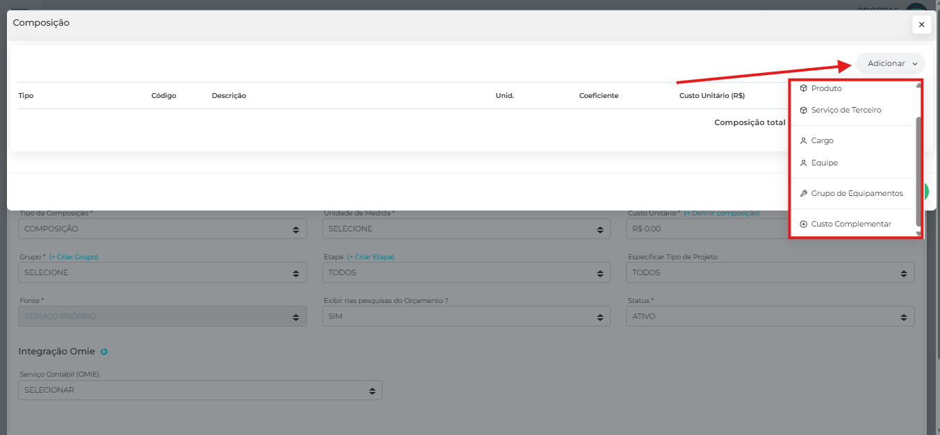 Após o preenchimento dos dados iniciais chegamos ao momento de definir os custos relacionados a composição. Para isso, no campo Custo Unitário acesse a opção "+ Definir Composições". Na tela que será carregada, ao clicar no botão "adicionar", você poderá adicionar Composições auxiliares, Produtos, Serviços de terceiros, Cargos, Equipes, Grupos de equipamentos e Custos complementares que irão definir o custo da sua composição.