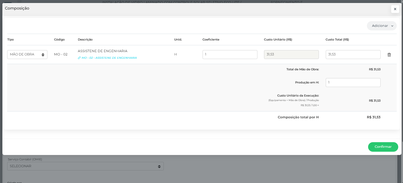 Abaixo pode ser observado um exemplo para um composição relacionada a venda de hora do cargo "Assistente de Engenharia".