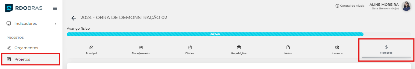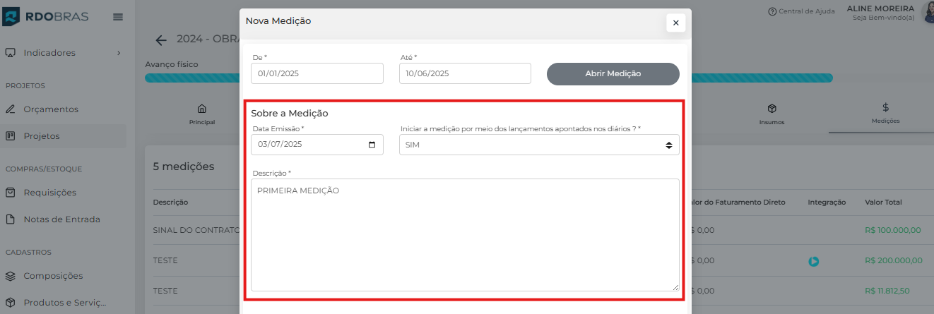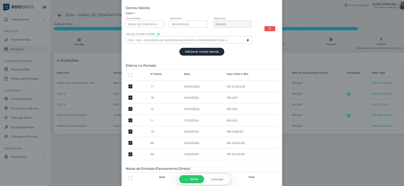 Observação: somente diários de obra aprovados podem ser medidos. Diários com status preenchendo ou para aprovação não estarão disponíveis.