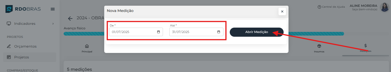 Feito isso, a seguinte tela será carregada, onde vamos definir o período referente a medição que está sendo criada. Após isso, somente é necessário clicar em "Abrir Medição" para prosseguir.