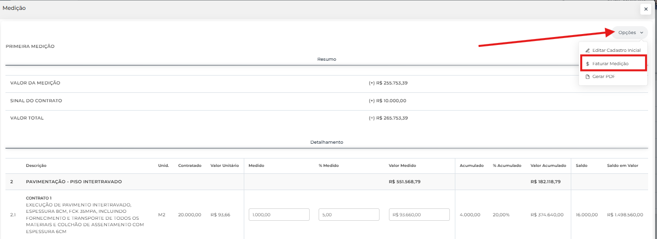 Para isso, será necessário clicar no botão "Opções" e acessar "Faturar Medição".