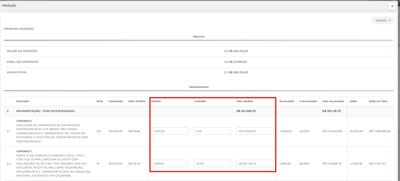 Caso necessário, nessa tela também será possível realizar ajustes nos quantitativos medidos. Lembrando que essa alteração é exclusiva para a sua medição, ou seja, os registros no seus diários permanecerão iguais.