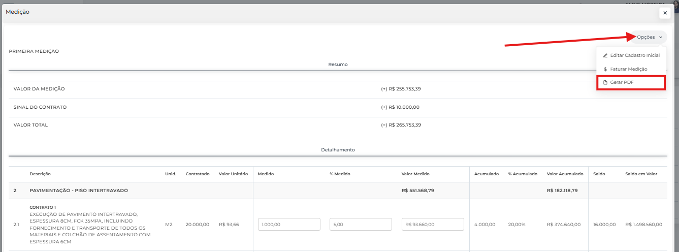 Após a conferencia dos dados, é possível gerar o PDF da medição, para que este seja enviado ao cliente para aprovação. Para isso, vamos clicar no botão "Opções" e acessar "Gerar PDF".