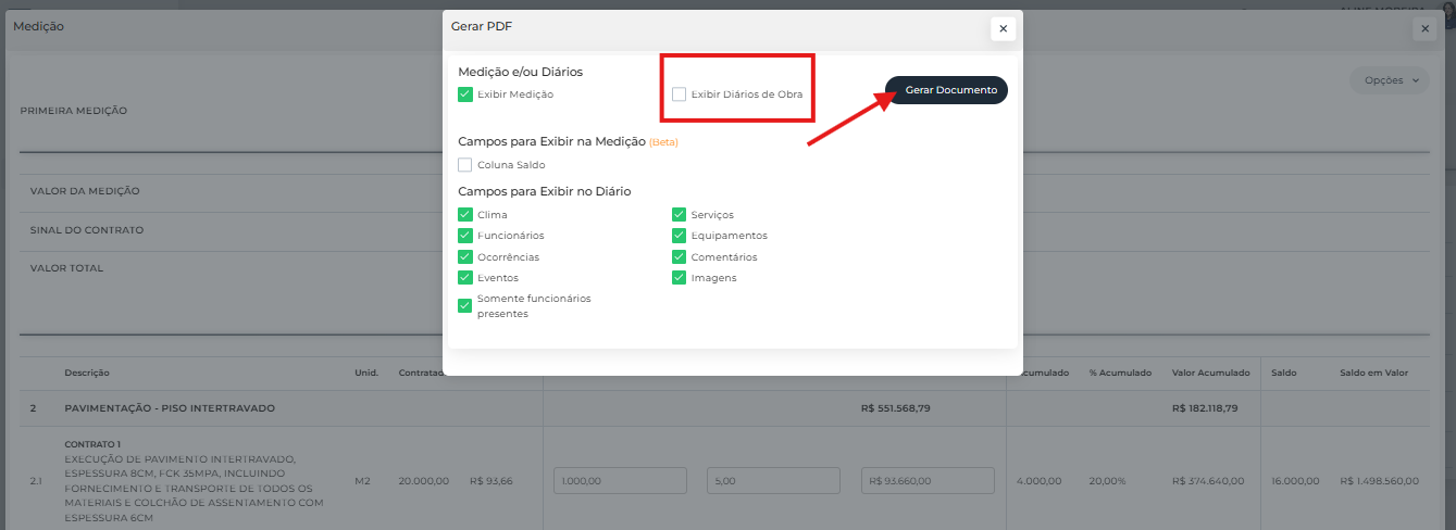 Feito isso, a seguinte tela será carregada, onde você pode gerar o documento apenas da medição ou incluir também os diários de obra do período.